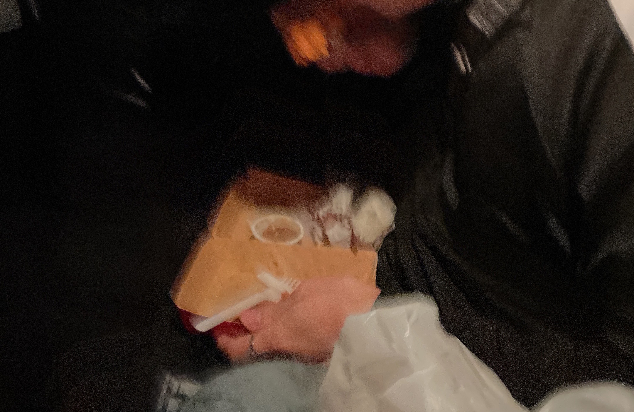 인터넷 후기에 졸리비에서 주는 연갈색 소스 별로라고 해서 기대안했는데 그냥 후추맛 소스였음. 나랑 남편은 신기하다면서 맛있게 찍어 먹었다. 흔들리는 차안에서 열심히 먹는 남편이 너무 웃겼다.